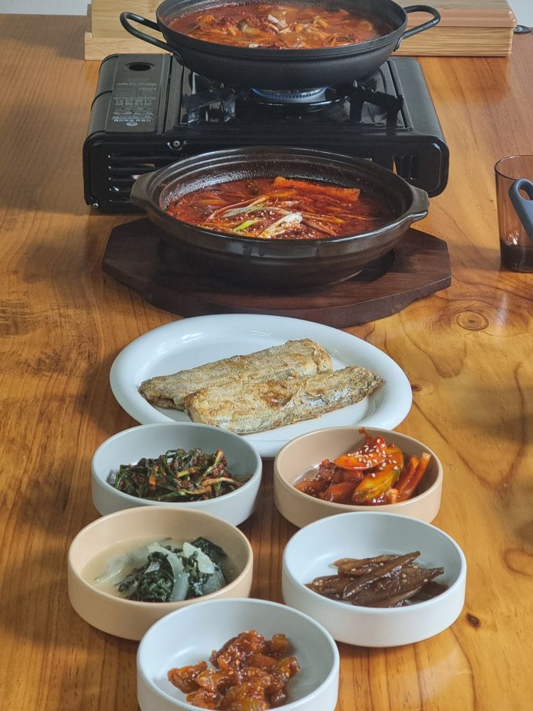 메인 메뉴인 갈치조림을 주문하고 잠시 기다리자, 보글보글 끓는 소리와 함께 뚝배기에 담긴 새빨간 갈치조림이 등장했습니다. 큼직하게 썰린 갈치 토막들과 푸짐한 무, 그리고 양념 위로 송송 썰린 대파와 청양고추가 시각적으로도 군침을 돌게 했죠. 한소끔 더 끓이니 양념이 서서히 갈치에 배어들면서 농도가 진해지는 모습이 인상적이었습니다.
