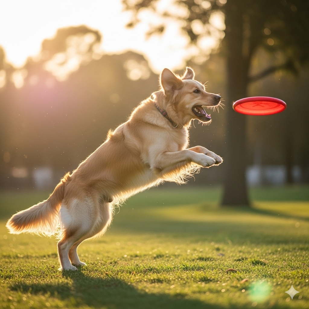 좋은 프롬프트 😊: "공원에서 원반을 쫓아 힘차게 달려가는 골든 리트리버, 역동적인 포즈, 햇살이 쏟아지는 화창한 오후, DSLR 카메라로 촬영한 듯한 사실적인 사진 스타일"