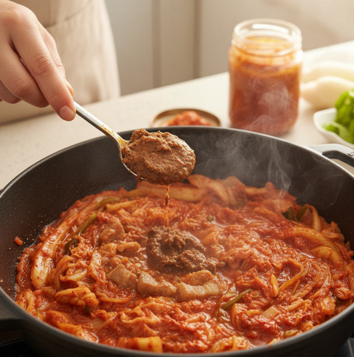 고기가 익으면 김치를 넣고 2~3분간 충분히 볶아주세요. 김치가 나른하게 익어갈 때쯤, 바로 그 비법 재료! 된장 반 스푼을 넣고 함께 볶아줍니다. 이때부터 주방에 구수한 냄새가 진동하기 시작할 거예요.