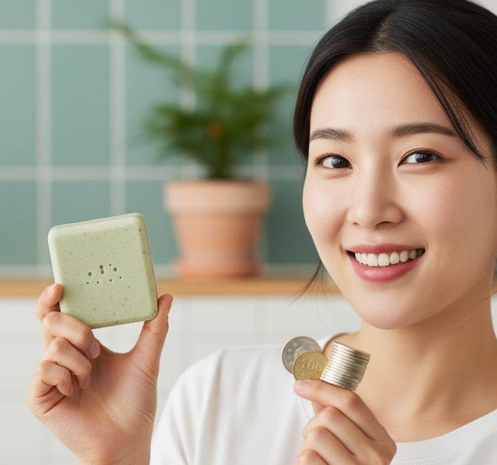 - 해결책: '고체 비누바(샴푸바, 린스바)'로 바꿔보세요. 샴푸바 하나는 액상 샴푸 2~3통과 맞먹는 양이라 훨씬 오래 씁니다. 가격도 1만 원 내외로 합리적이죠.