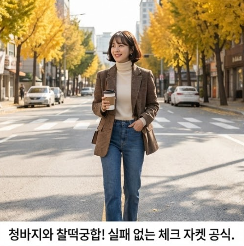 이런 고민이 있다면 해답은 **'데님(청바지)'**입니다. 클래식한 체크 자켓에 캐주얼한 청바지를 입으면, 격식은 갖추되 너무 딱딱하지 않은 '꾸안꾸(꾸민 듯 안 꾸민 듯)' 룩이 완성됩니다.